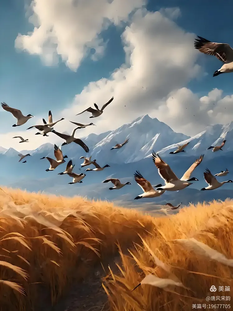 金菊歌冬意,玉苇舞秋声。恰逢重九鹤城行。枫红柿紫,雨霁碧空澄。蓝天鸿雁过,唳唳长啸赞许,潇洒银龄。